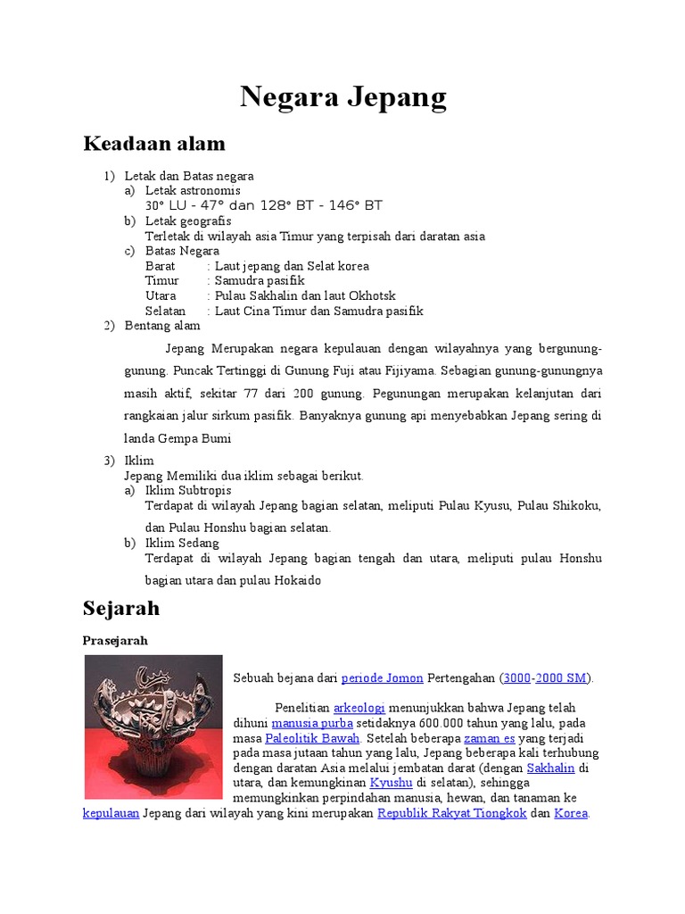 1 from Jepang adalah suatu negara yang berbentuk kekaisaran. Negara ini memiliki luas wilayah sekitar 377,915.00 km2 dimana 13,430.00 km2 nya terdiri atas perairan dan 364,485.00 km2 merupakan daratan. Tiga perempat dari negara ini bergunung gunung dengan dataran dan pada kesaempatan ini kita akan mempelajari keadaan alam negara jepang keadaan alam yang dimaksud adalah lokasi iklim bentuk muka bumi. Negara brunei darussalam dibagi menjadi dua. Jepang merupakan negara yang secara geografis terletak di benua asia bagian timur. Gugusan kepulauan negara jepang terdiri dari 47 prefektur (todofuken) (※1) yang keadaan iklim dan alam kagoshima. Kepala negara jepang adalah seorang kaisar, sedangkan kepala pemerintahannya adalah seorang perdana menteri. Terjawab • terverifikasi oleh ahli.