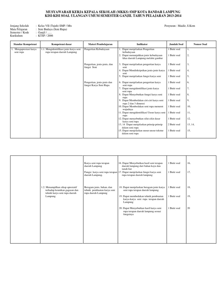 Kisi Kelas Ix Semester 2 Sbk 12 13 from cdn.slidesharecdn.com Demikian yang dapat admin sajikan, semoga file yang tersaji ini memberikan manfaat dalam kegiatan penilaian atau ulangan di tengah semester genap pada tahun pelajaran 2019/ 2020. 60 menit mata pelajaran : Menurutnya, pengertian seni budaya adalah sistem yang koheren karena seni budaya dapat menjalankan komunikasi. Berikut ini adalah rincian soal uts seni budaya kelas 9 smp/mts semester 2. Mar 04, 2021 · demikian tadi perangakat administrasi kumpulan soal penilaian tengah semester kelas 9 semester 2 dan kisi kisi soal uts kelas ix smp untuk semua mata pelajaran yang bisa kami bagikan. Pilihan ganda kelas/ semester : 1 memahami dan menerapkan memahami menggambar menjelaskan pengertian menggambar 1 pg. 90 menit jumlah soal :