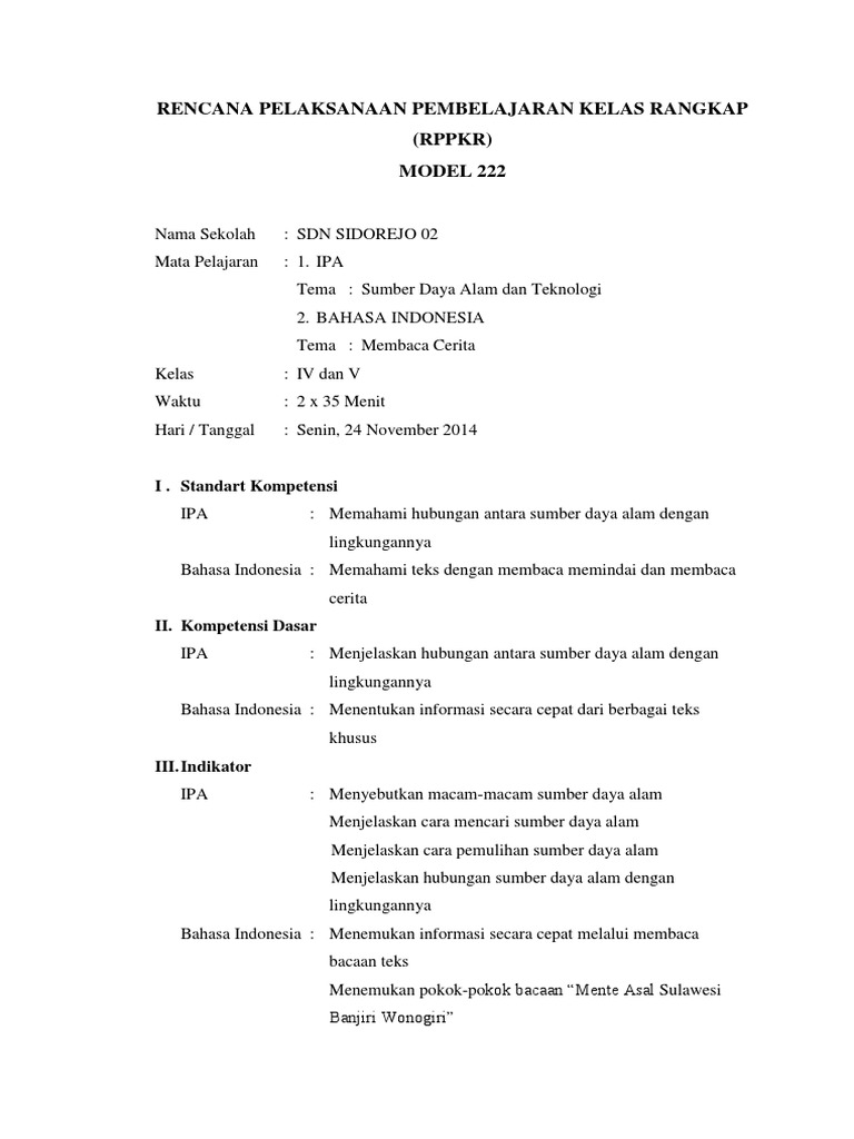 Standar kompetensi ipa kelas v 1. Kelas rangkap model 222 k13 dan ktsp kurikulum pendidikan belajar. View rencana pelaksanaan pembelajaran model 222 dan 221.docx from aa 1rencana Mi muhammadiyah karanganyar model pkr : Bahasa indonesia tema 3 benda di sekitarku wujud benda 2.