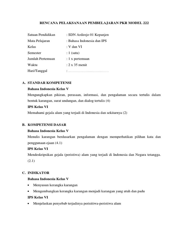 Rpp Pkr K13 Model 222 - Rpp Model 221 Pkr Id 5c5c8e42dce83 - Materi pokok bahasa indonesia kelas v pengalaman siswa ips vi gejala alam indonesia f.